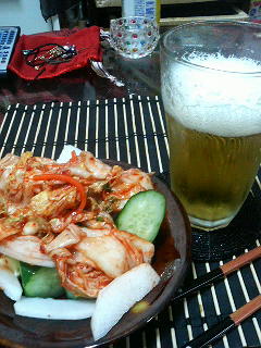 野菜盛り(キムチ乗せ)&ビール(゚∀゚